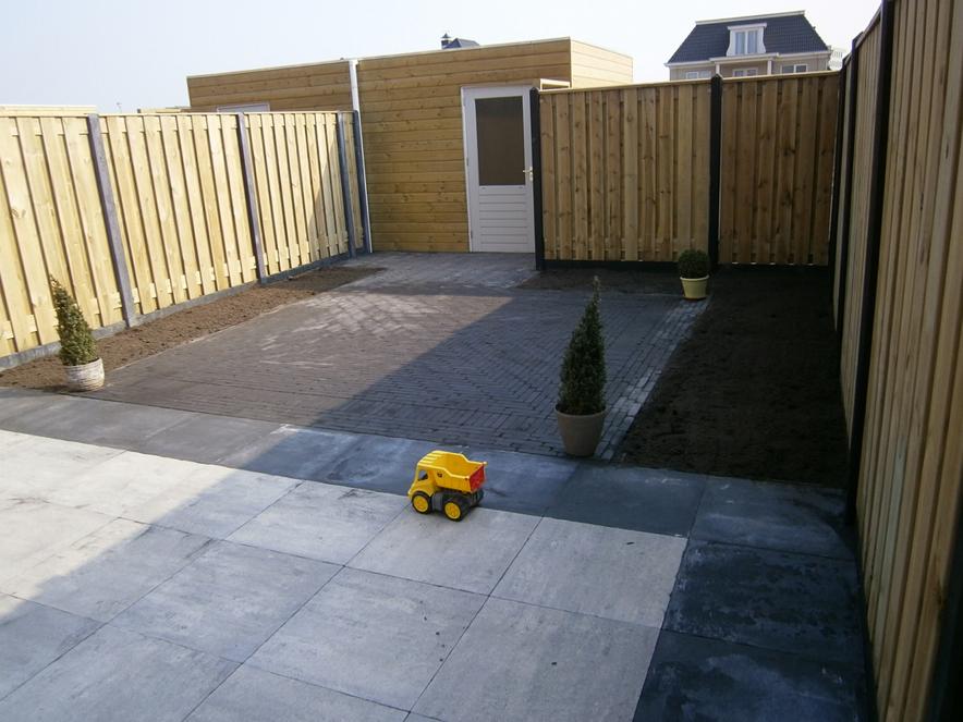 De tuin is verder bestraat met gebakken waaltjes in de kleur Terra Carbona Antica. De combinatie van deze kleuren en soorten sierbestrating geven de tuin een moderne uitstraling.