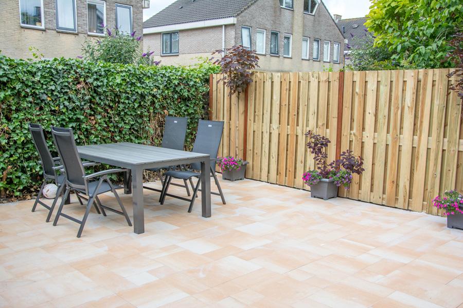Naast het bouwen van de veranda is een nieuwe houten schutting geplaatst. De tuinschermen zijn aan elkaar gezet met stevig bevestigingsmateriaal, dit is cruciaal voor een lange levensduur van de schutting. Voor extra privacy heeft de schutting een dichte structuur. Doordat de planken aan de voor- en achterkant over elkaar heen vallen wordt een dichte schutting gecreëerd.