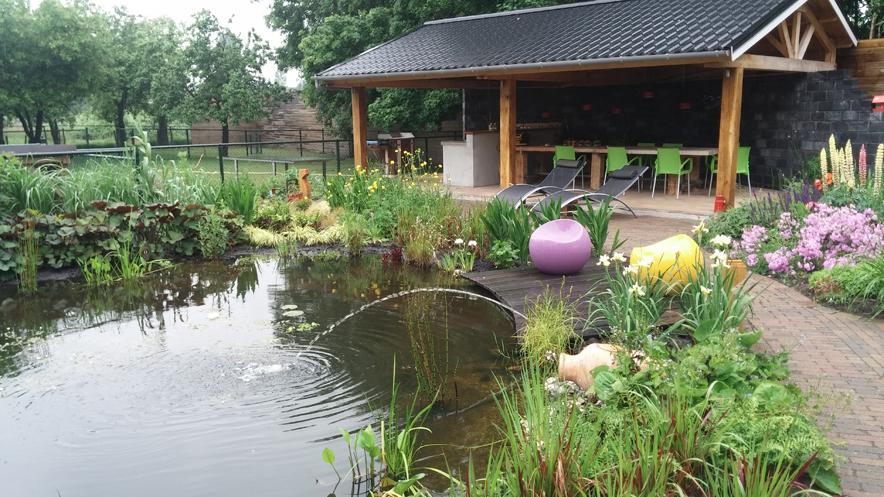 In deze tuin is gekozen voor een natuurlijk vijver. Dit is een vijver waarbinnen het leven (planten en dieren) elkaar in evenwicht houden.