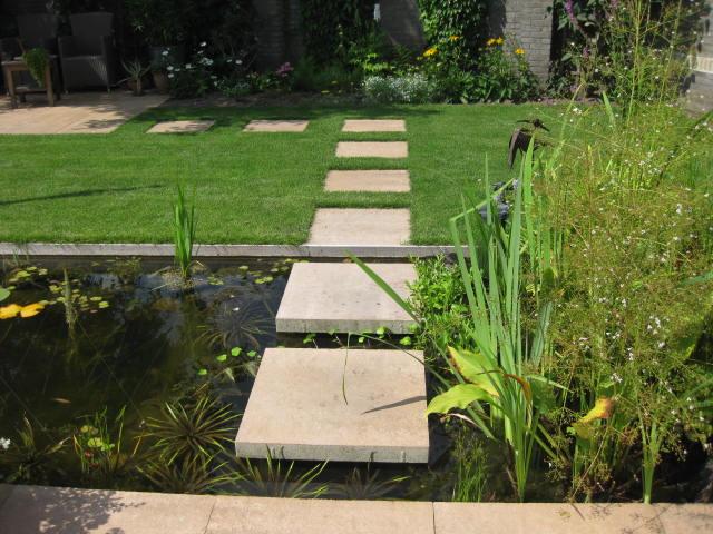 Het sfeervolle terras wat met staptegels doorloopt over de strakke vijver, zorgt voor een heerlijk beschutte plek van de tuin te kunnen genieten. De diverse hoogteverschillen in deze levende luin geven de het geheel een speels karakter.